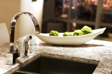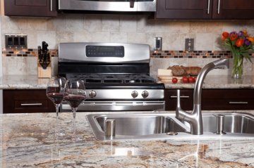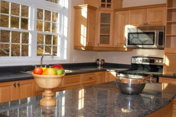 "Rich and dramatic, the granite countertops showcase a mesme...